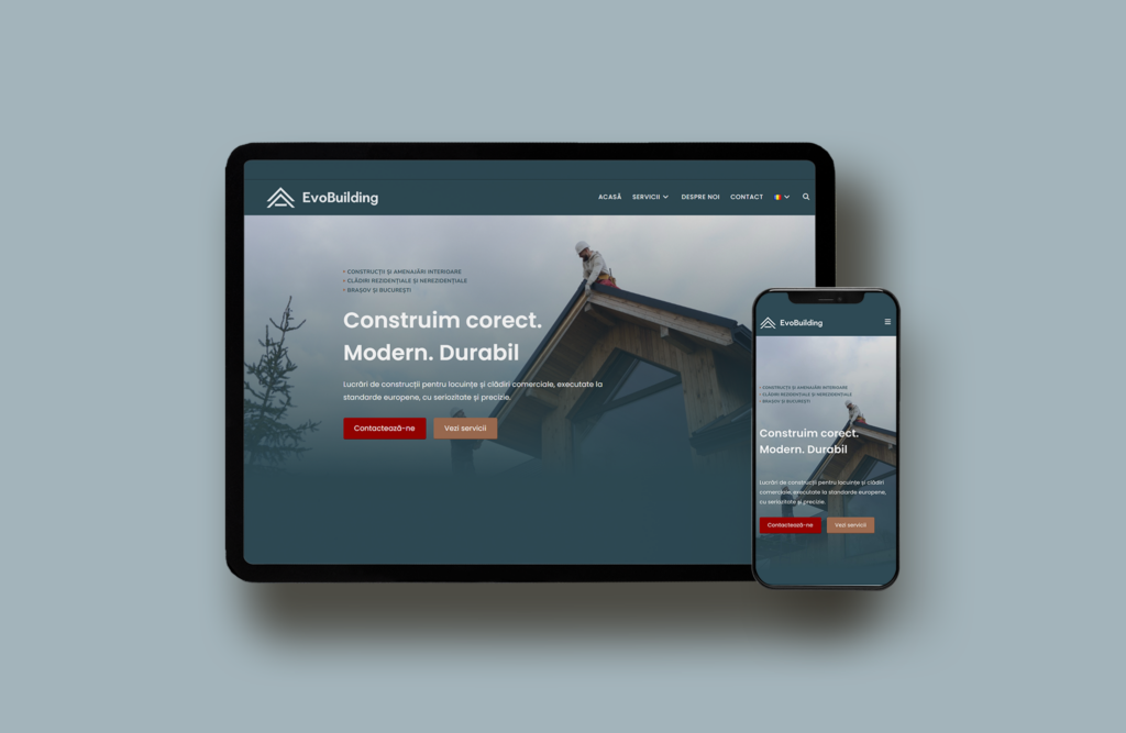 Web design, identitate vizuală și dezvoltare de conținut pentru Evobuilding – un site de prezentare modern pentru o companie din domeniul construcțiilor, conceput pentru a transmite profesionalism, seriozitate și încredere.